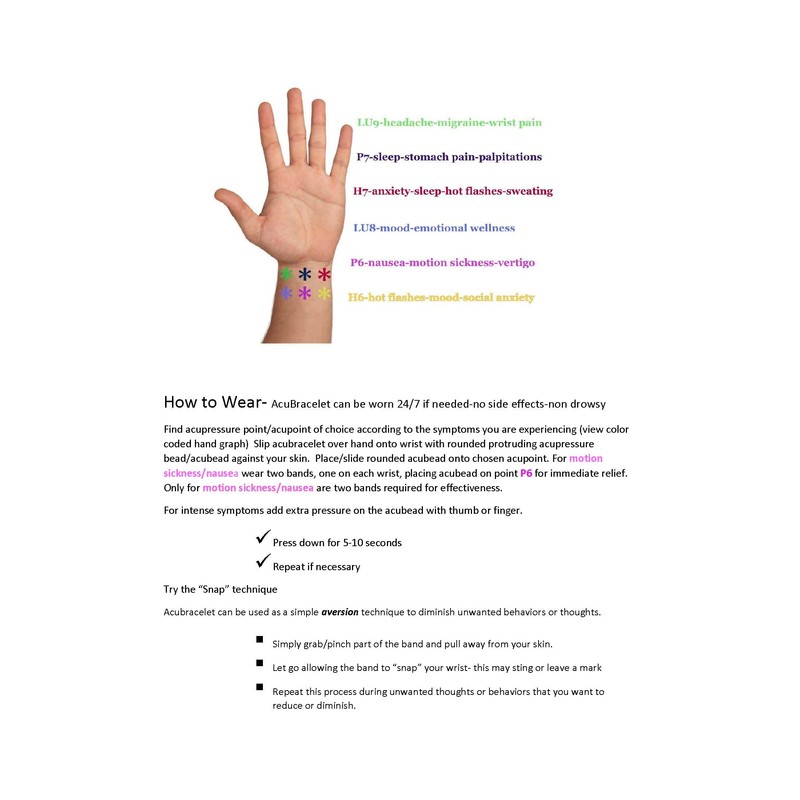 - Fast Relief-When correctly worn acupressure bracelets are very effective. Follow directions for rapid relief. Hand graph with acupressure point locations included with every purchase.