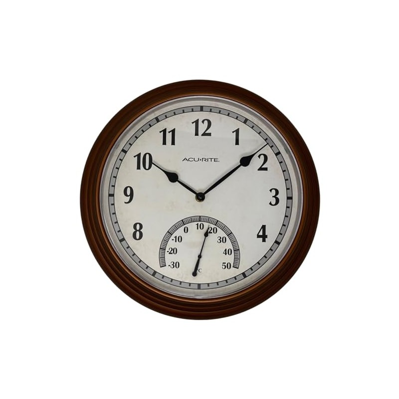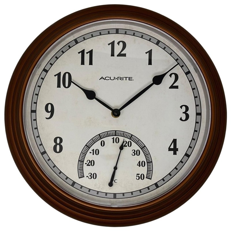 AcuRite 02368CAL: 13.5-Inch Indoor/Outdoor Round Analog Clock & Thermometer, All-Weather Frame, Copper Finish, Quartz Timekeeping