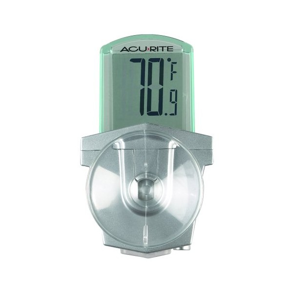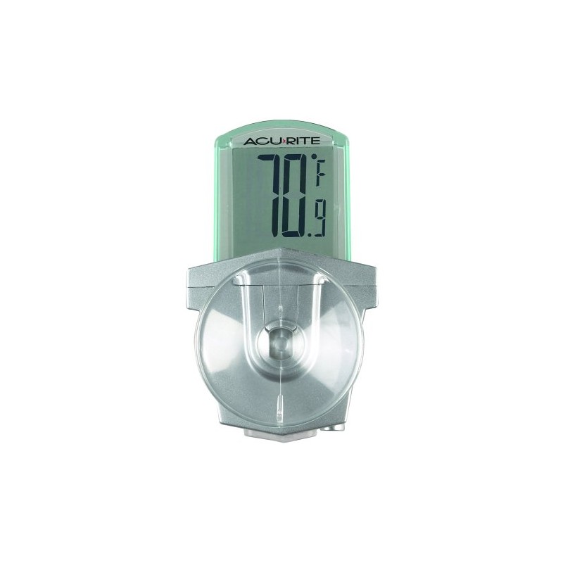 Anticipate cold weather with a quick glance out the window at this digital outdoor window thermometer. Made by Chaney AcuRite, the thermometer sticks to any surface with a large, rubber suction on its metallic mount. The thermometer's digital display conveys the temperature in easy-to-read 3/4-inch-high numerals. To offer illumination, a translucent pale green LCD frame borders the screen. The thermometer measures temperatures ranging from -4 to +158 degrees Fahrenheit to the tenth of a degree for precision; Celsius readings are not available with this item. Weather-resistant, the thermometer provides an on/off switch on its base underneath a weather-proof rubber seal. For the best results, install the thermometer out of direct sunlight. Moisten the suction before applying it to a clean window pane to ensure a strong bond. While the thermometer's screen is not backlit, by painting or covering its backside white, the light from the frame may allow nighttime reading. A pre-installed L1154 cell battery powers the thermometer and can be replaced using a small Phillips screwdriver. Made in China. The thermometer measures 2 inches wide by 1/2 inch deep by 3-1/4 inches high and weighs 2 pounds upon shipping.
