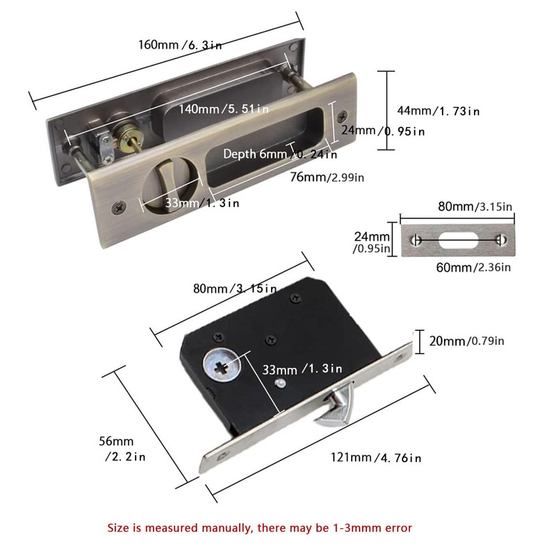 - Dimensions: L 160 mm/6.3in, W 44 mm/1.73in; Body:L 80 mm/3.15in, W 55 mm/2.2in; Centre distance: 35 mm/13.8in, Suitable for door sizes: 35-50 mm.1 Set of locks includes 3 keys. Dimensions are measured manually and may vary by 1-3 mm.Please refer to the picture for details