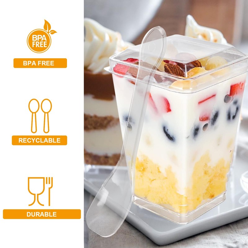 - Perfect Match - Each square mini dessert cup comes with a lid and a small spoon. Guests can enjoy the dessert immediately or close the lid and take it away while keeping the dessert fresh and prevent dust from falling.