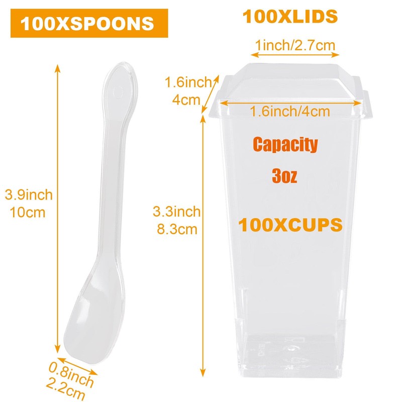 ACXFOND 100 Pack 3 oz Square Mini Dessert Cups with Lids and Spoons Clear Plastic Dessert Cups Appetizer Cups Mini Parfait Cups for Pudding Fruit and Ice Cream