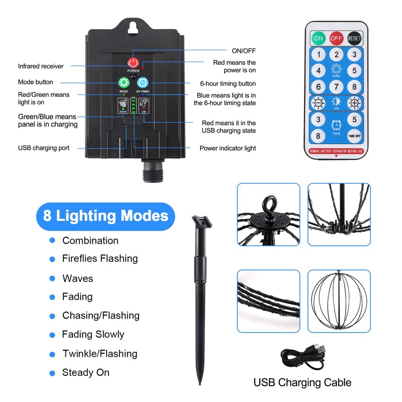 - Remote Control & 8 Modes: You can use the remote control to turn on/off, adjust the brightness(25% 50% 75% 100% four levels of brightness), choose light modes, timing. 8 Different lighting modes: fireflies flashing, waves, fading, chasing/flashing, fading slowly, twinkle/flashing, combination and steady on. Buttons on the back of the solar panel control lighting mode, timing and turn on/off.