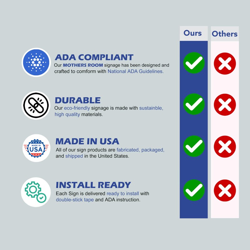 - 🤱 HIGH VISIBILITY SIGNAGE: ADA Central Signs are 100% ADA compliant and have a non-glare finish for improved visibility. Maintain public ADA rules, including raised symbols and lettering. A Mothers room is a dedicated space where breastfeeding mothers can comfortably, conveniently, and privately express breast milk.