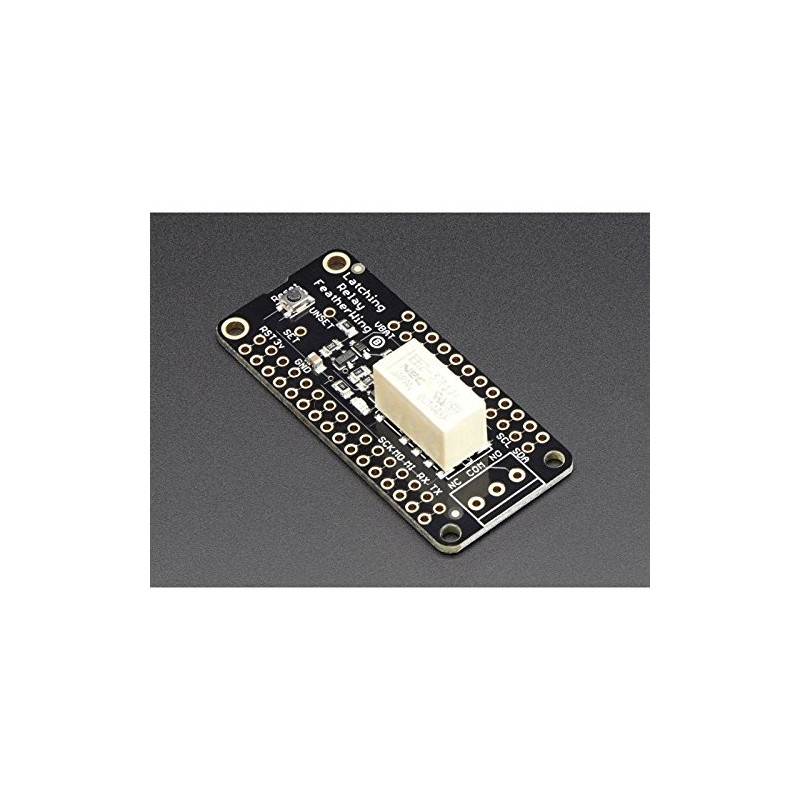 A Feather board without ambition is a Feather board without FeatherWings! This is the Latching Mini Relay FeatherWing. It gives you power to control, and control over power. Put simply, you can now turn on and off lamps, fans, solenoids, and other small appliances that run on up to 250VAC or DC power using any Feather board.