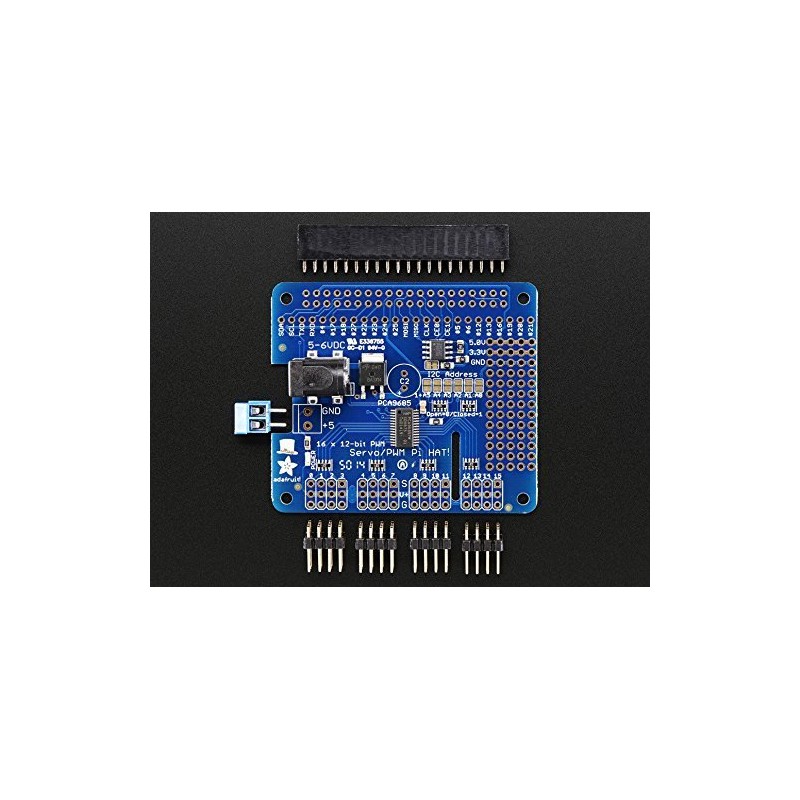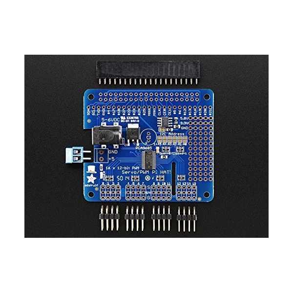 The Adafruit 16-Channel 12-bit PWM/Servo HAT will drive up to 16 servos or PWM outputs over I2C with only 2 pins. The on-board PWM controller will drive all 16 channels simultaneously with no additional Raspberry Pi processing overhead. What's more, you can stack up to 62 of them to control up to 992 servos - all with the same 2 pins!