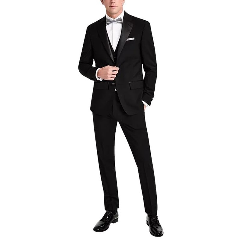 - Jacket: Modern fit, satin notch lapels, single breasted, two-button closure, two front flap pockets with black satin besom, chest pocket, 3 interior pockets, double side/back vents, fully lined, button detail on sleeve: Vest: single breasted 5 button closure, fully lined, adjustable back strap