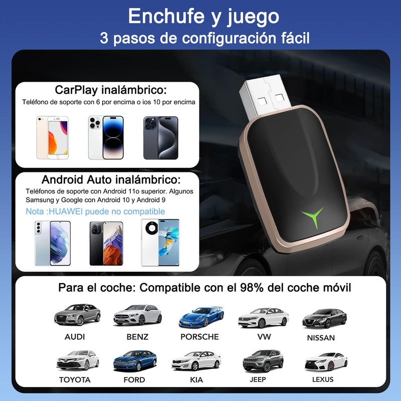 - Amplia compatibilidad: este adaptador inalámbrico CarPlay es compatible con el 95% de los modelos de coche y es compatible con una amplia gama de modelos.El adaptador inalámbrico Android Auto es un adaptador inalámbrico CarPlay para Android 11.0+ e iOS 10+. El adaptador inalámbrico CarPlay es compatible con puertos USB-A y USB-C y admite la mayoría de sistemas de vehículos con CarPlay y Android Auto.