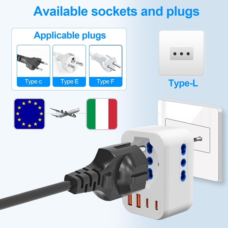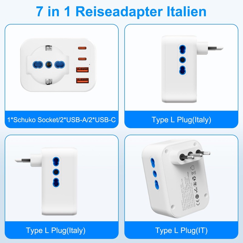 - 7 in 1 Italy plug adapter: Clomnpe Schuko to travel adapter Italy has 2 Italian sockets + 1 Schuko plug + 2 USB-A ports and 2 USB-C ports. You can charge 7 devices at the same time at high speed. Maximum power up to 2500 watts (max. 250 V, 10 A); the USB A port output is 2.4 A (5 W); the USB C port output is 3 A (5 W), take only this one adapter Italy with you to charge everything on the go