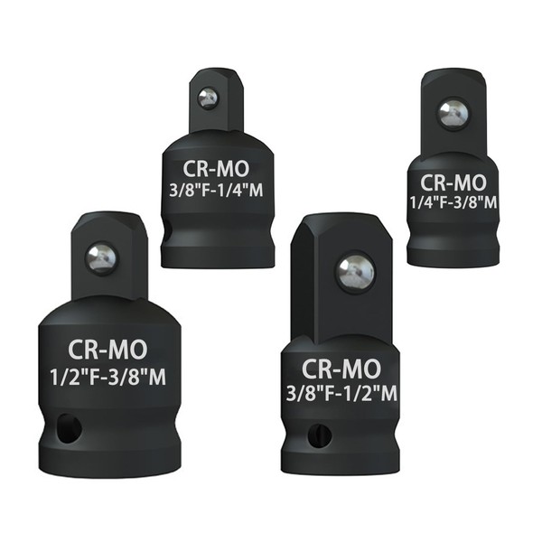 - Versatile adapter set - Includes 4 socket adaptors: 1/4 inch to 3/8 inch, 3/8 inch to 1/4 inch, 3/8 inch to 1/2 inch and 1/2 inch to 3/8 inch - ideal for quick change between different square sizes for ratchets and impact wrenches.