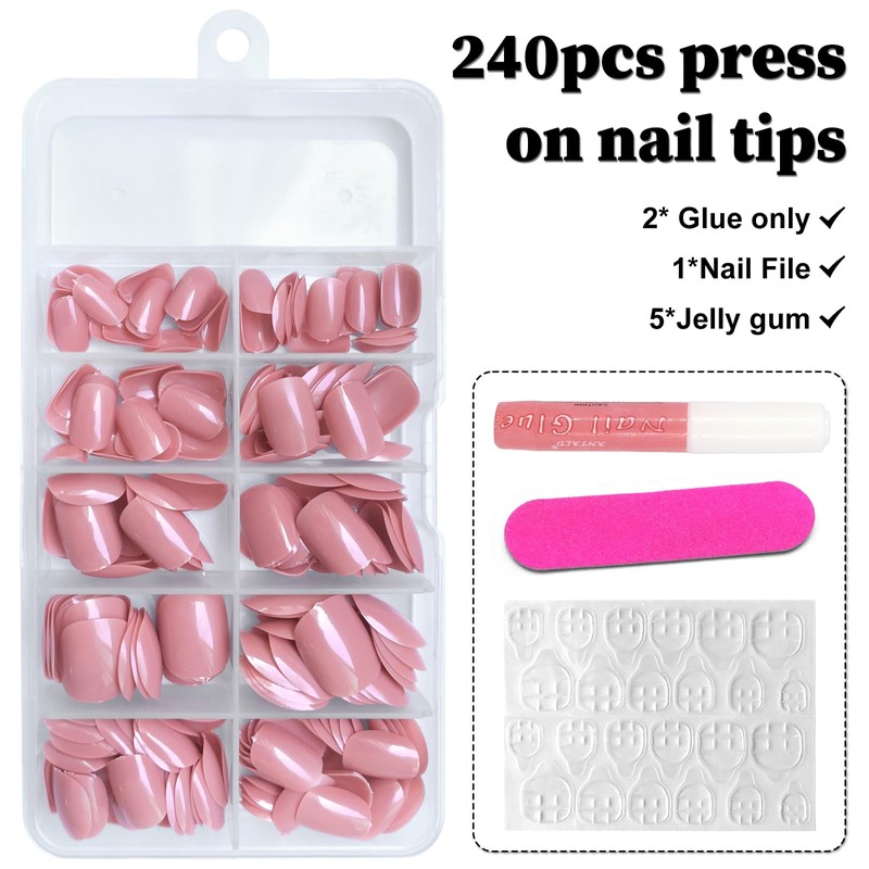 - Short press on nails kit with nail glue: included 240pc/set solid colored glossy shiny pink press on nails for women girls teens kids diy nails manicure. 5 sheets adhesive glue sticky tabs, 2 nail glue, 1 mini file, come with everything you need for a quickly DIY nail art manicure, you don’t need to purchase anything else. Save your money and time