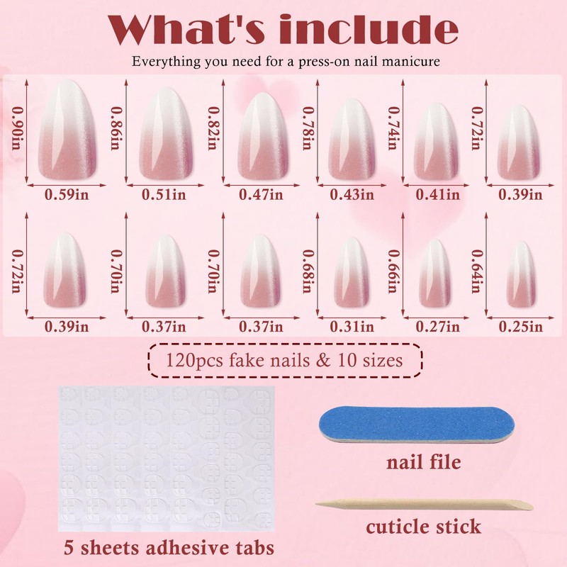 - Pink White Ombre Press On Nails Kit: Each kit includes 120 glossy ombre press on nails, 5 sheets of adhesive tabs, a mini nail file, and a wooden cuticle stick for a complete at-home nail experience. These odorless, safe for natural nails press ons ensure a worry-free application process