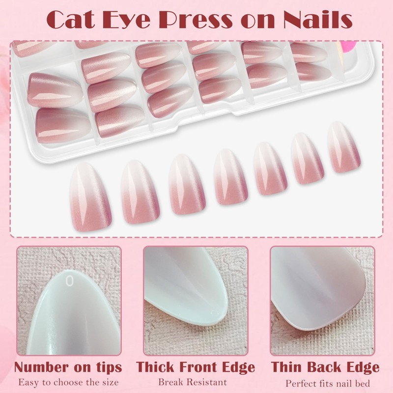 - Stunning Cat Eye Almond Press On Nails: Transform your nails with a captivating cat-eye effect! These medium length almond shaped press on nails feature a unique, almond fake nails are glossy design with a mesmerizing cat eye shimmer that will make your manicure stand out. Perfect for women who want a bold yet elegant look for any occasion