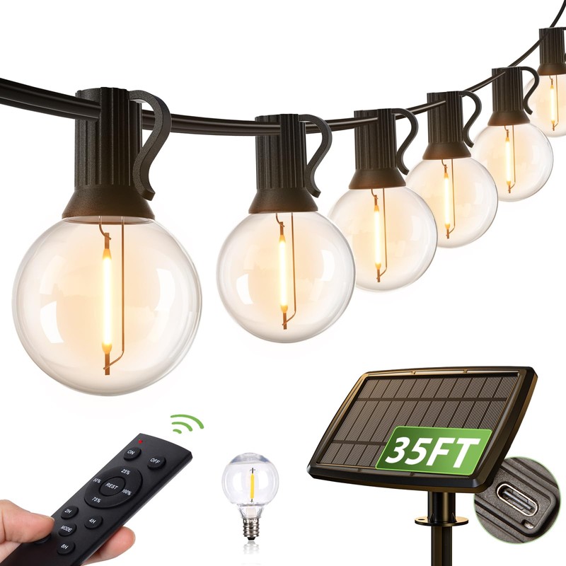 - 【Flexible Placement Solar Outdoor Lights】: The total length is 35 feet, featuring one string lights equipped with 15 super energy-saving G40 LED bulbs and 1 spares. With a 6.5 foot distance from the solar panel to the initial bulb, you have the freedom to position the solar lights wherever desired, unconstrained by power outlets.