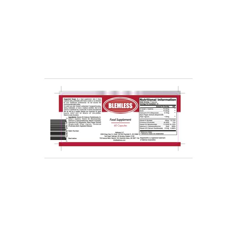 - Important update: Blemless now proudly manufactured in the UK as capsules. Blemless is designed as a skin supplement that may help control excessive skin sebum levels. Up to a 30 day supply to help keep your skin clear and your mind happy.