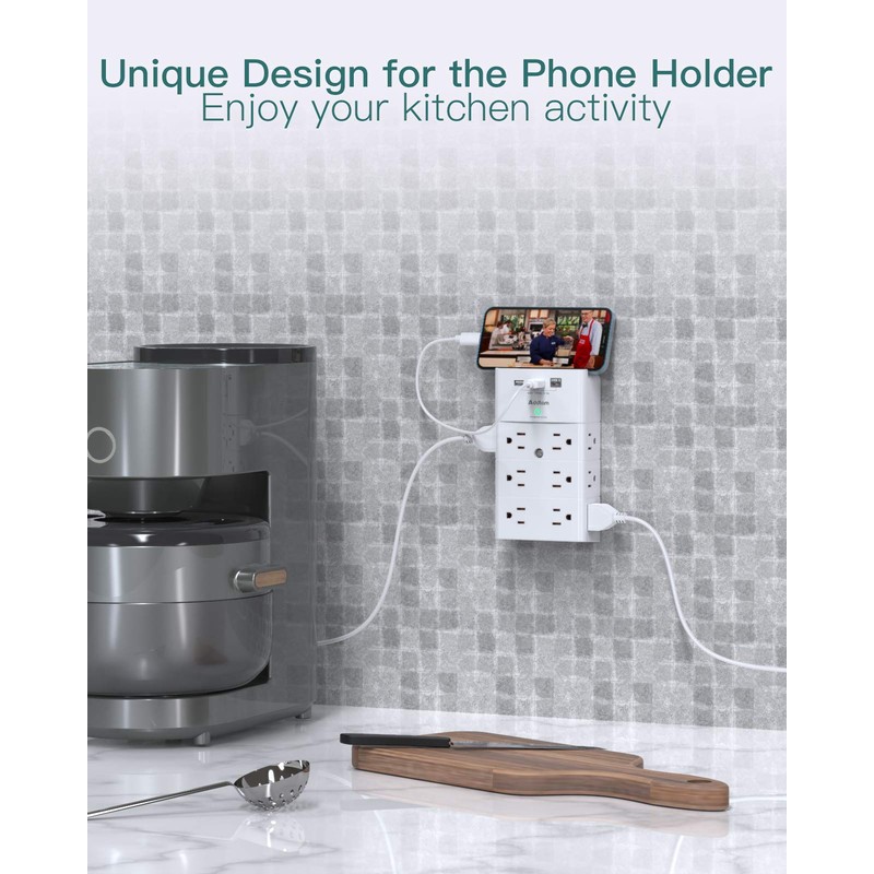 - 【4 Sides Power Outlet】 With 4-side design, you can have 12-outlet Splitter in limited space, enable to fit 12 standard plugs at the same time. The top phone holder design take more convenience for you, like watching movies while you cooking.