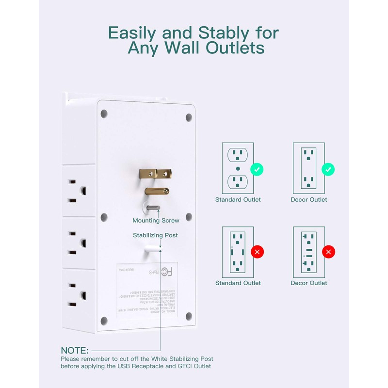 - 【Multiple Outlet Wall Plug】 12 AC outlets (125V, 15A,1875W) with surge protector wall mount, 3 USB ports, surge protection indicator light. With mounting screw and stabilizing rod, the outlet wall adapter can fit for the standard outlet, decorator outlet; For GFCL and USB Receptacle outlet, the stabilizing rod can be cut off