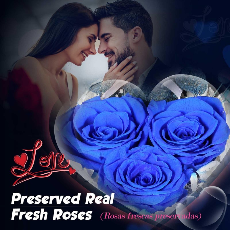 - Eternal Rose & Adorable Bear: This gorgeous heart-shaped arrangement features 3 preserved blue real roses made from 100% fresh blooms. These roses have been preserved through a unique process, ensuring they will maintain their natural appearance for up to 3-5 years without any maintenance required. No need to worry about pollen or allergies either! And the cute, handmade moss bear with a sparkly crown adds a charming touch to the presentation