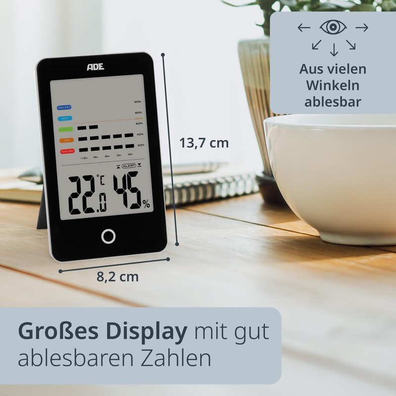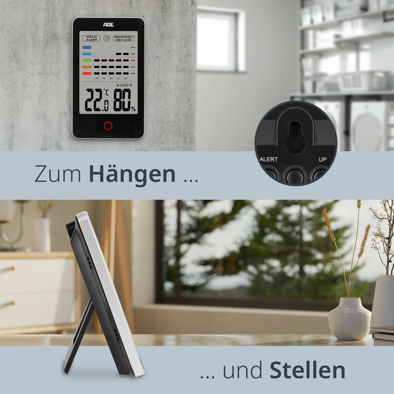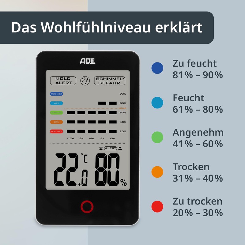 - Visual mould alarm: the humidity meter measures the humidity in the room and warns if this value becomes too high (limit values can be adjusted individually). 5 moisture levels: too wet, damp, optimal, dry, too dry