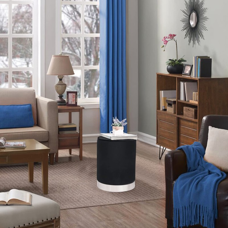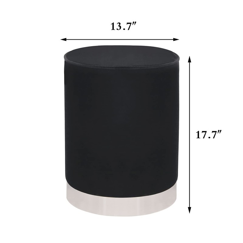Adeco Round Upholstered Velvet Ottoman with Silver Metal Base, Makeup Vanity Chair Soft Compact Padded Foot Rest Stool for Living Room Bedroom, Black