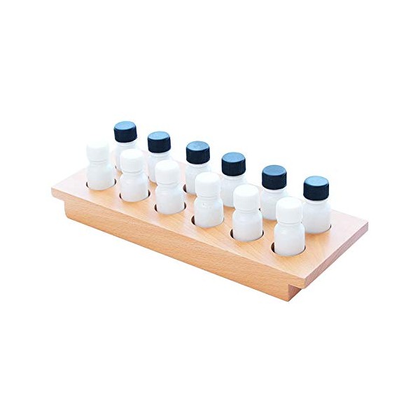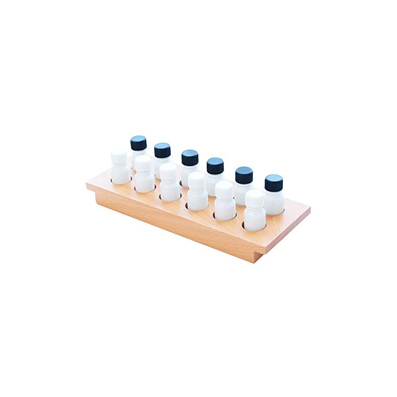 - 2 sets of 6 sealed wooden cylinders that make a distinctive olfaction. Materials Two wooden boxes each containing six smelling bottles each - twelve bottles in all. One set has a white cover with hollow cylinders having white lids, the other box has a white cover with hollow cylinders having black lids. The smelling made by the cylinders are paired, i.e. The smelling made by one cylinder in the white set matches the smelling made by its equivalent cylinder in the black. set.