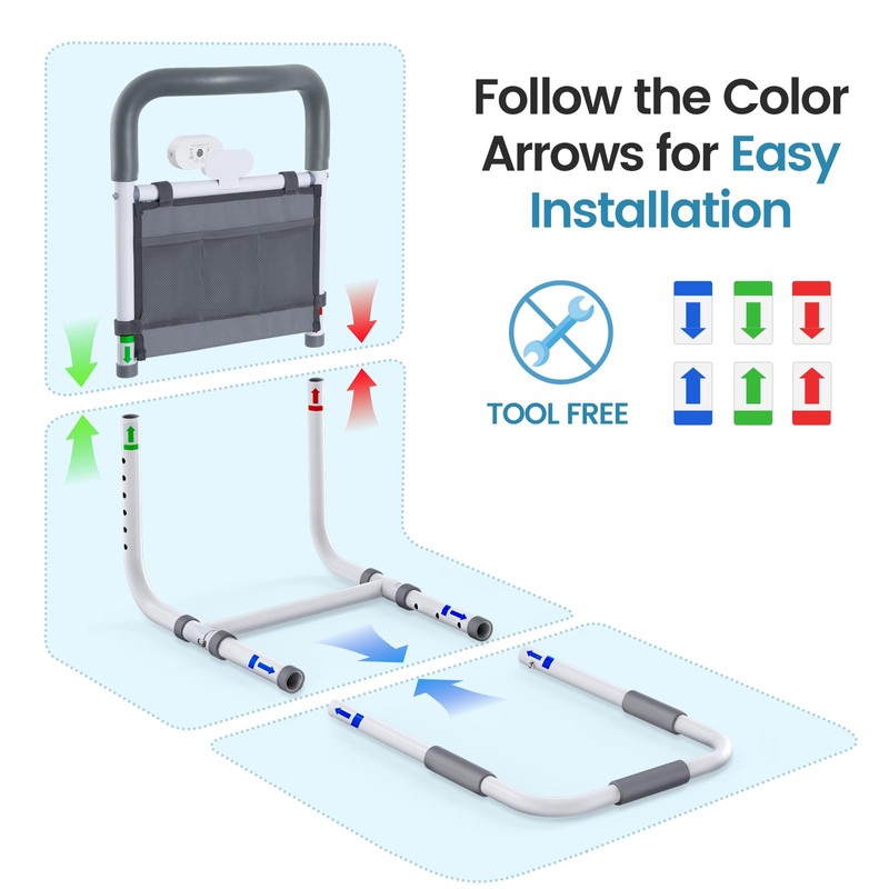 - Tool-free Installation: Aderi pre-assembled parts of this bed guard rail can save you from the hassle of installation. Just follow the removable color-arrow stickers on the tubes to assemble 3 parts without tools easily. The bed rails for elderly provide enough stability and leverage to help seniors get in and out of bed safely.