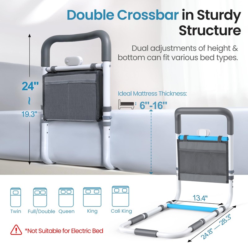 - Adjustable Design with Superior Height for Universal Fit: The bed assist rails for seniors come with an adjustable height that ranges from 19.6" to 25" higher than other similar products in the market. This bed assist rail can extend between 24.8" to 28.3 horizontally, offering a more customized fit for twin, full/double, queen, and king size beds.