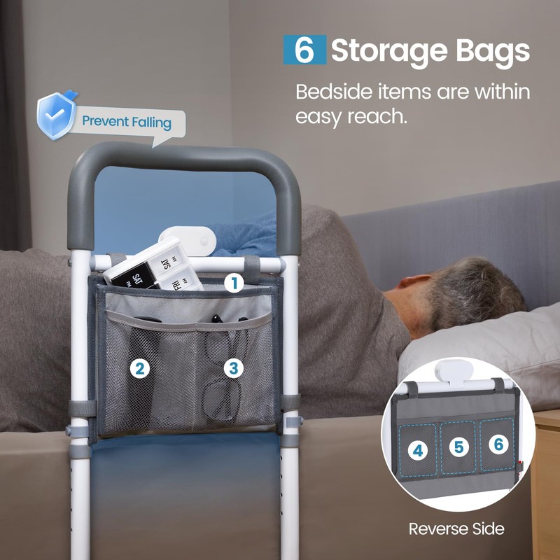 This bed assist rail is thoughtfully designed with 6 storage bags, making bedside items within easy reach.