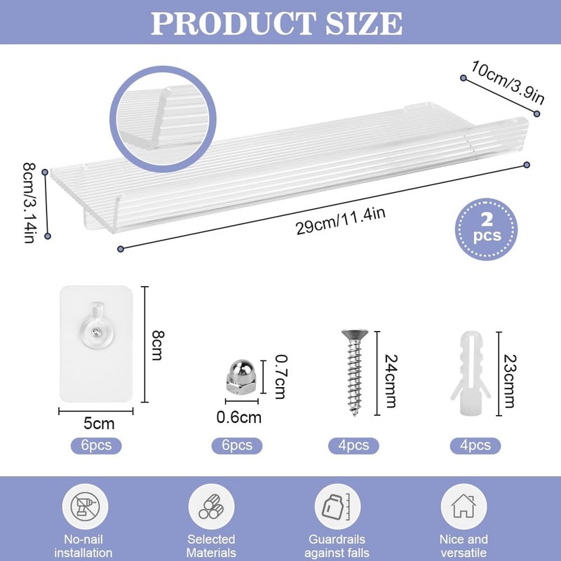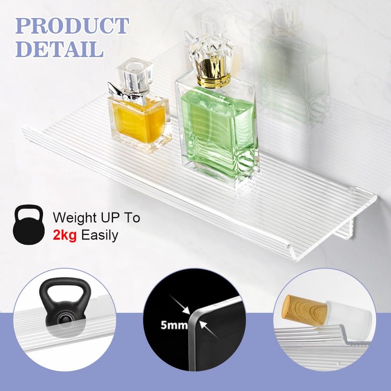 • 【Increased & Excellent Load Capacity】: Wall space is hard to use, these clear acrylic wall shelves make good use of the wall space. For small spaces or if you need to increase the storage space, transparent shelves without drilling are an excellent choice. Its load capacity is 2 kg.
