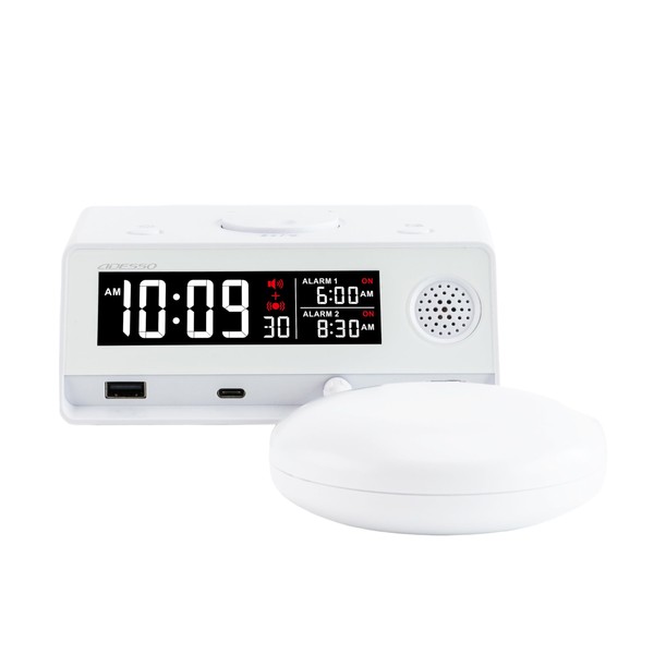 Adesso BB-330 Alarm Clock, Super Bull Crash, Vibration, Loud Volume, 100 Decibels, Double Alarm, Snooze Function, USB Charging, White