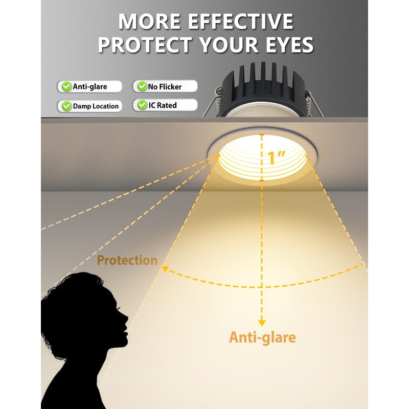 • Anti-Glare Design: Adetu 2 inch LED downlight is equipped with an innovative anti-glare mechanism. This design effectively eliminates harsh and glaring light. This 2 inch recessed LED downlight's deep baffle design and COB spotlight luster optical lens create a soft lighting effect free of flickering and annoying glare, providing you with a gentle and comfortable illumination experience. 2 inch canless recessed light is also suitabled for kitchens, bedroom, living rooms, bathroom, hallways, office and more.