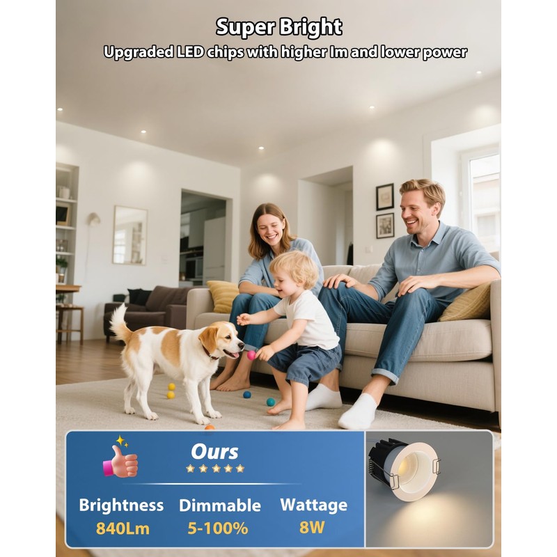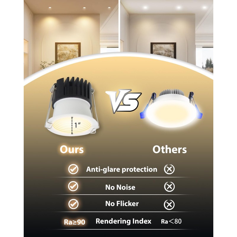 • Dimmable with High CRI: This 2 inch LED recessed ceiling light works smoothly with modern dimmers, offering 5% - 100% dimming. With CRI 90+, it shows accurate colors for better visual comfort. The 2 inch canless recessed lighting is compatible with most dimmers.