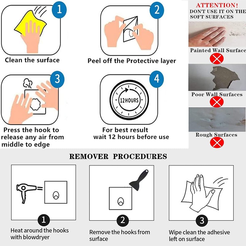 • 💪Notice:It is not recommended for painted walls, paper wall, foam plastic, uneven tiles ect. It is not recommended to hang articles that is hazardous or anything that is valuable.Make sure there is no air bubble betweeen the hook and the surface.For best result, don't hang anything for the first 12 hours after installation.