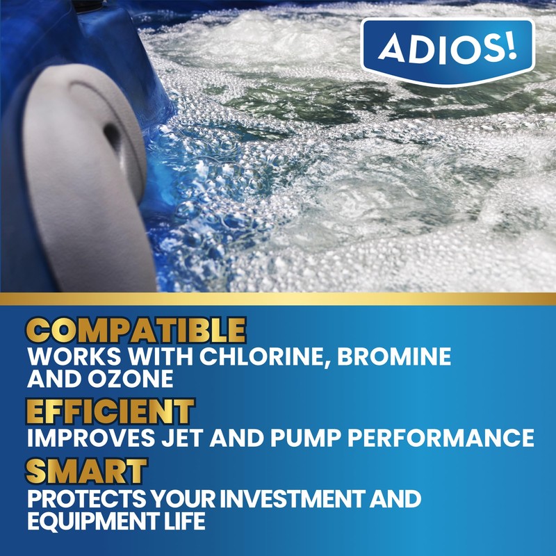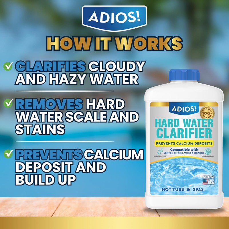 - CLARIFIES SPA WATER – Quickly turn cloudy hard water into a clear and inviting oasis with Adios! Hard Water Clarifier. By dissolving problematic minerals, our clarifier helps filters remove problem causing deposits from spas and hot tubs.