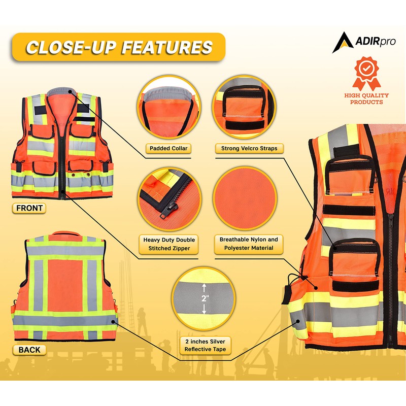 AdirPro Surveyor Safety Vest with Pockets - High visibility Reflective Construction Vest for Men - Class 2 Heavy Duty Vest ANSI Complaint for Contractors and Surveyors (Orange, Medium)