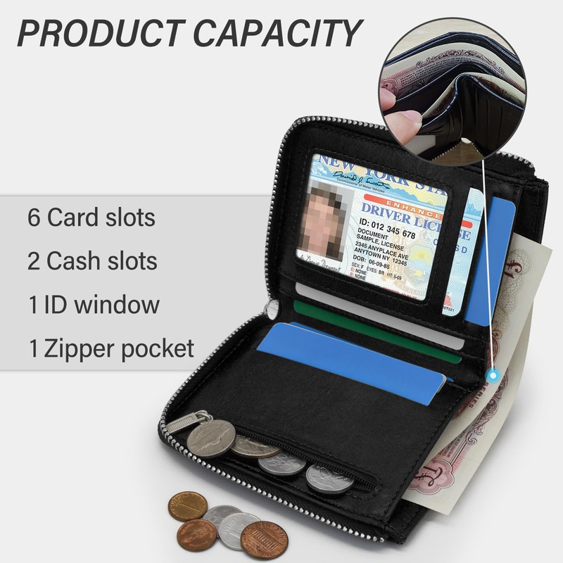 - Practical Storage Space: The leather wallet has six card slots, an ID window, two cash slots, and a zippered coin pocket, providing ample storage space for easy management of various cards, cash, and change