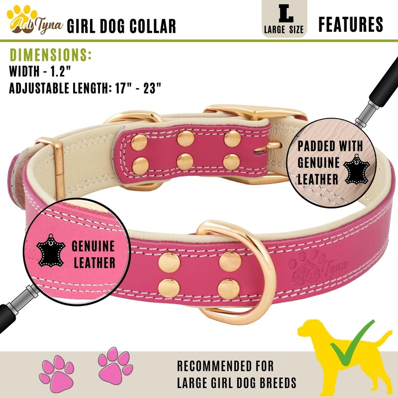 ADITYNA - Heavy-Duty Premium Pink Leather Dog Collar for Large Dogs - Padded with Soft Genuine Leather for a Cozy Feel - Girl Dog Collar (Pink - Gold Colored Buckle, Large: Fit 17-23" Neck)