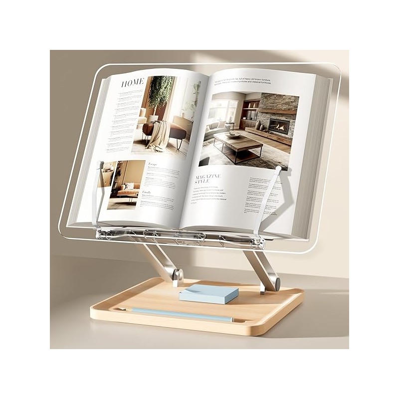 Adjustable Acrylic Book Stand for Reading, UPERGO Book Holder with Pen Slot, Foldable Desktop Riser for Laptop, Recipe, Textbook - Hands-Free,Cookbook Stand, Clear Design with Page Clips