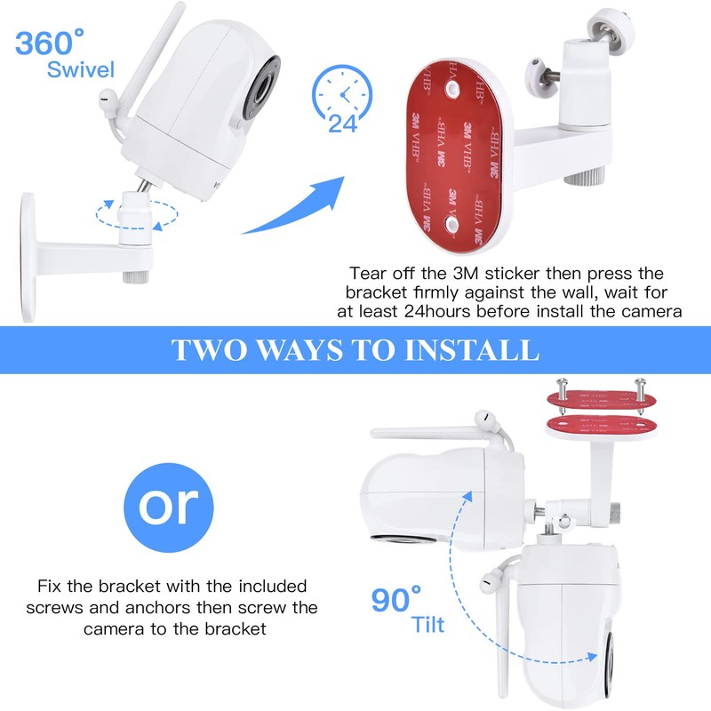- ❤ Install with screws or adhesive tape, two mounting ways for your choice. (Note: After the adhesive tape, wait for at least 24 hours before installing the camera.)