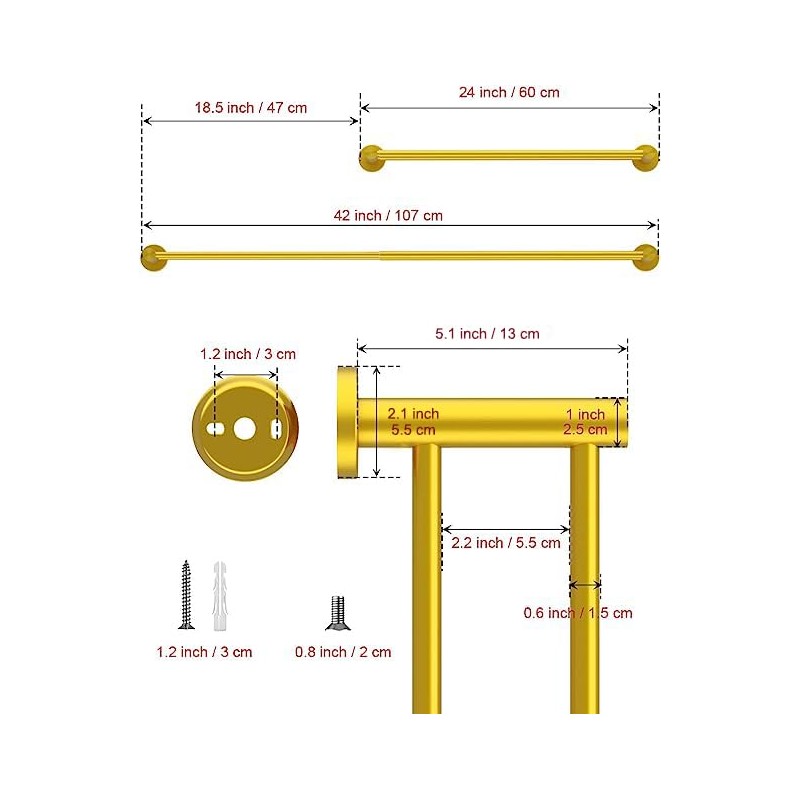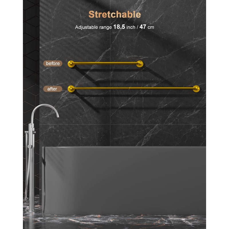 - Sizes and Material: Retractable double bath towel bar from 23.6 Inch to 42 Inch, 1.0 inch/2.5cm tube diameter,screws length 1.6"/ 4cm,you can install it in any length if you wish. Spreading out your towels fully with this towel bar, speed up drying. Constructed of SUS304 premium thicken,ANTI-RUST solid and durable stainless steel. Perfectly smooth brushed gold finish is built to resist daily scratches, corrosions, and tarnishing.