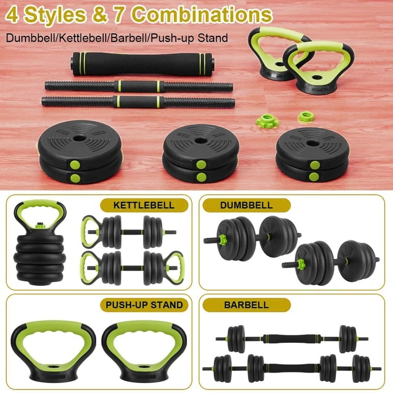 - 4-IN-1 DUMBBELL WEIGHTS : The 4-in-1 adjustable dumbbell set allows you to have a set of dumbbells, kettle bells, barbells, push-ups four exercise modes, which is easy to install. The weight plate adopts an octagonal design to prevent rolling and is easy to store.
