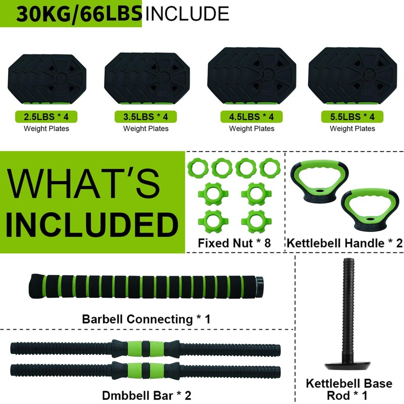Adjustable Dumbbell Set,66bs Free Weight Set with Connector, 4 In1 Dumbbells Set Used As Barbell, Kettlebells, Push Up Stand,Green and Black,O