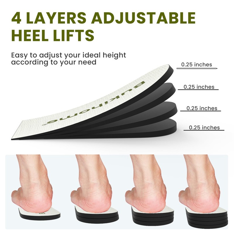 - Adjustable Height :The heel lifts for men and women feature an adjustable height with four layers, each measuring 1/4" in height, for a combined total of 1 inch.This allows you to customize the height by adding layers as needed. In addition, our shoe lifts come with 12 strong adhesive tapes.The strong adhesion ensures that each layer of the lift is tightly bonded together and won't come apart over long periods of time.