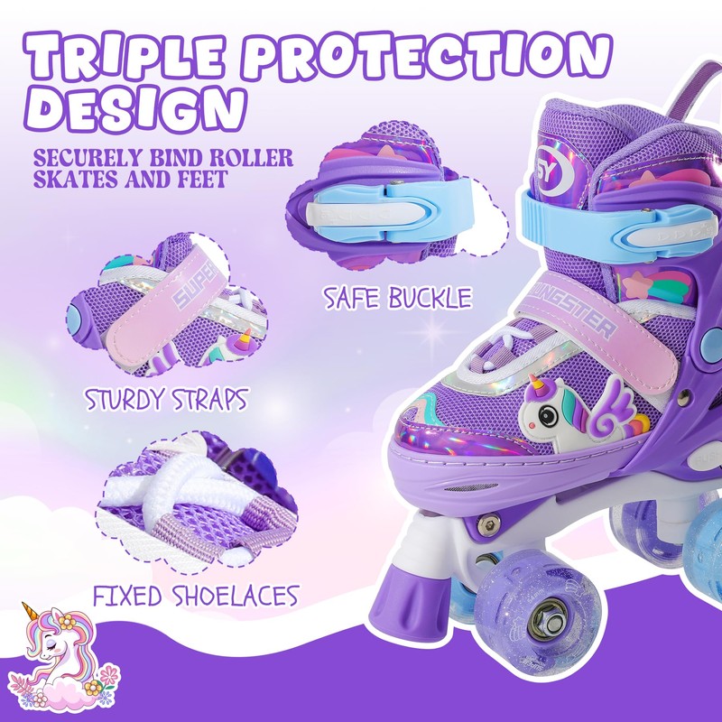• 8 LIGHTED WHEELS - Our roller skates have 8 PU lighted wheels per pair, the lights are driven by the skate to light up when skating, safer and more energy efficient. It will make roller skating more fun and make your kids love this sport more. Can't imagine how cool roller skates will be at night under the light!