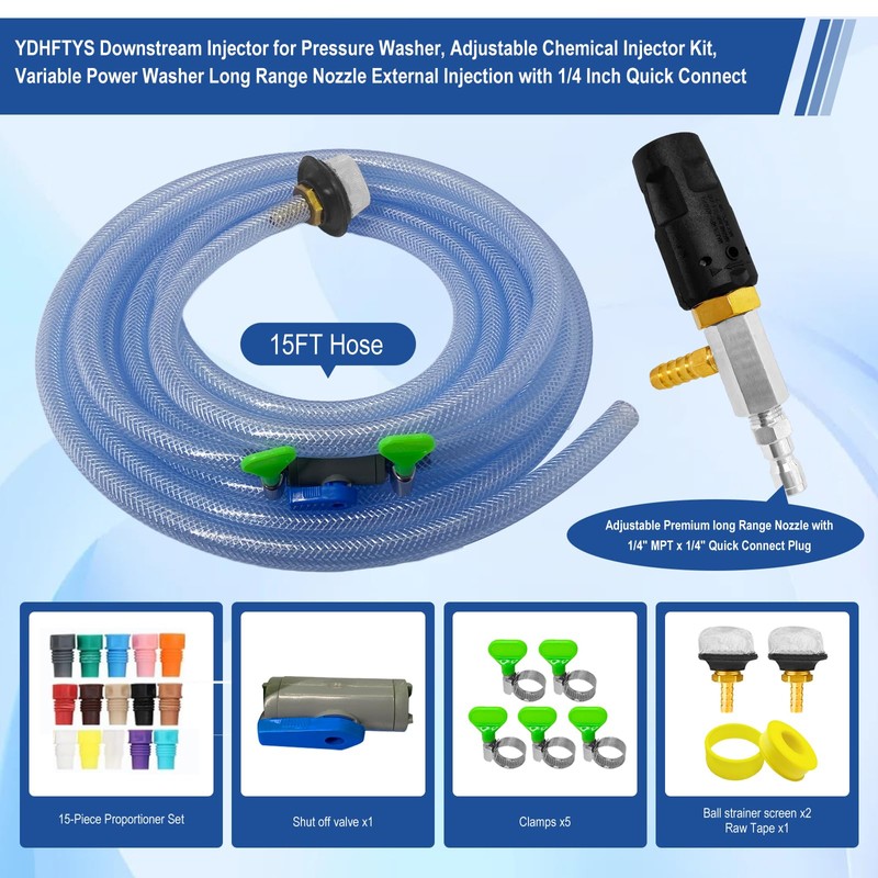 - Adjustable Long Range Downstream Injection Nozzle Kit Pro-Grade Cleaning with Easy Chemical Mixing: Includes an adjustable premium long range nozzle with 1/4" MPT x 1/4" quick connect plug, 15ft hose, and a 15-color coded proportioner set. Also comes with shut-off valve, clamps, ball strainer screens, raw tape, and manual for precise mixing and smooth flow. Perfect for cars, windows, pool decks, and garage floors. Need help? Contact us anytime for fast, friendly support.
