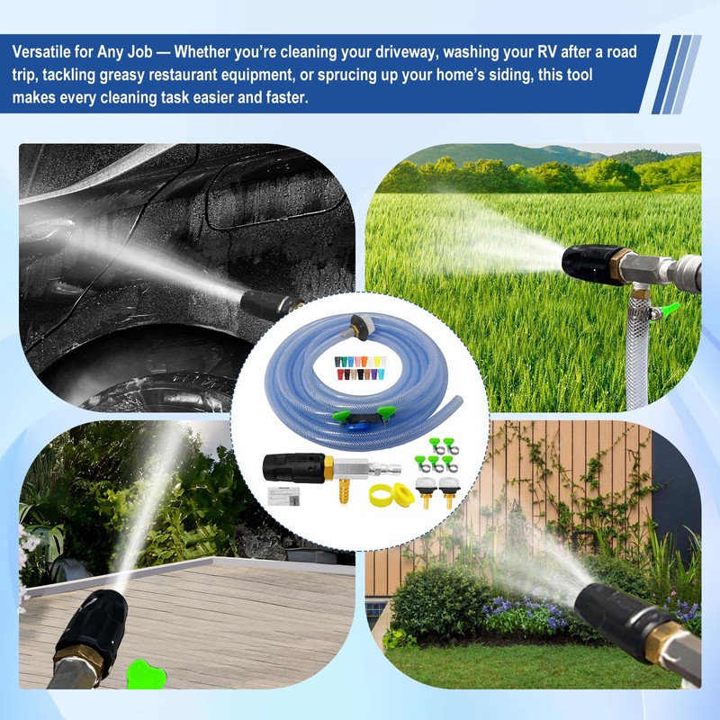 - Protect Your Pressure Washer from Chemical Damage: This YDHFTYS chemical injector nozzle draws cleaners straight from a bucket, keeping harsh chemicals out of your pump, hose, and gun. Comes with a 15-color coded proportioner set and a 15ft hose with inline shut-off valve and tank screen filter for effortless, accurate mixing. The long range nozzle has a universal 1/4" quick connector for easy attachment to your pressure washer gun or wand, protecting your equipment from corrosion.