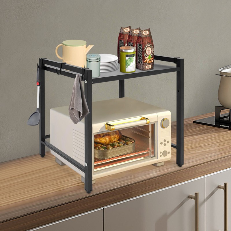 Adjustable Microwave Stand Black Oven Shelf Kitchen Countertop Organizer W/Hooks