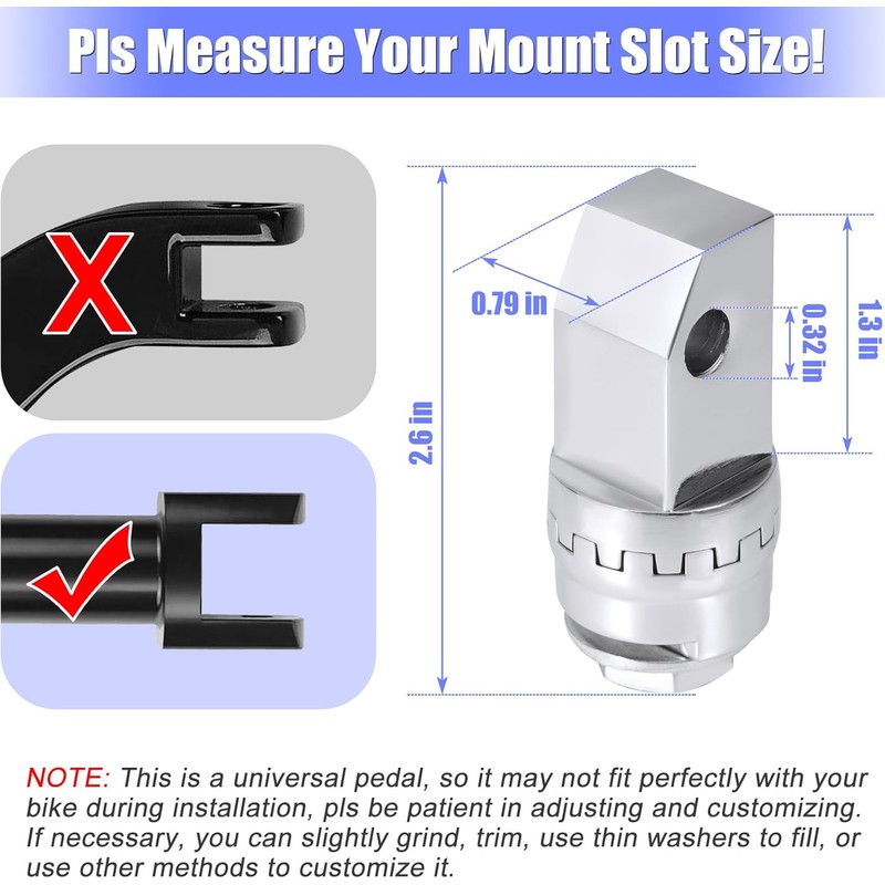 ★【Pls Measure Your Mount Slot Size!!!】--Before purchasing, please measure the width of your mount slot and compare it with our adaptor size to confirm the floorboards are suitable for your motorcycle.