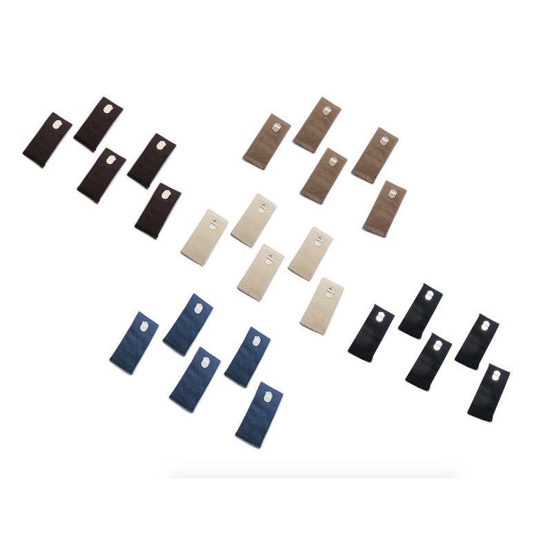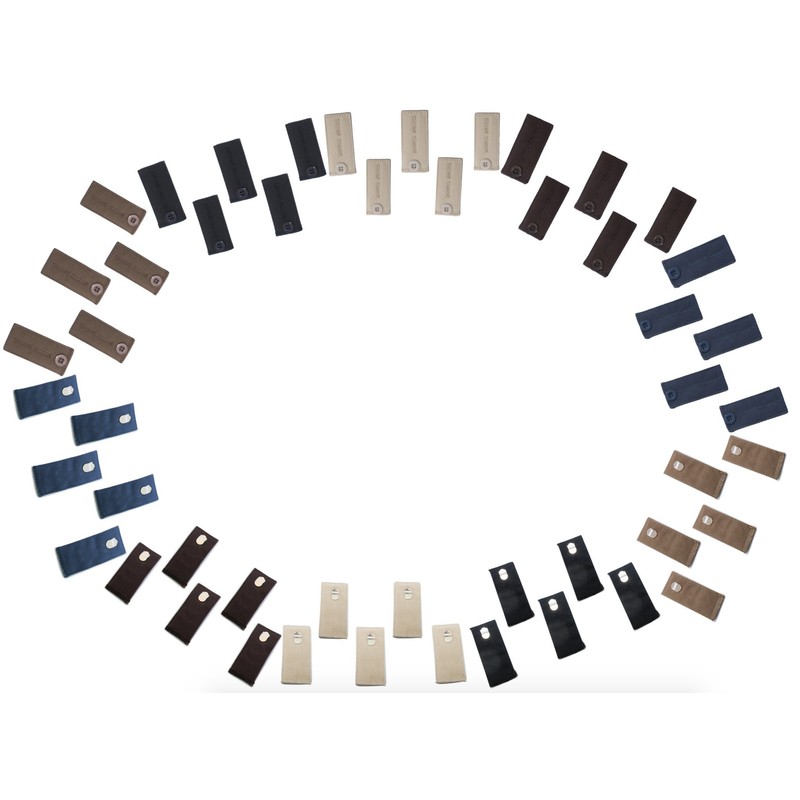 Each package comes with 5 different Waistband Extenders in the following colors: black, khaki, blue, brown, taupe grey