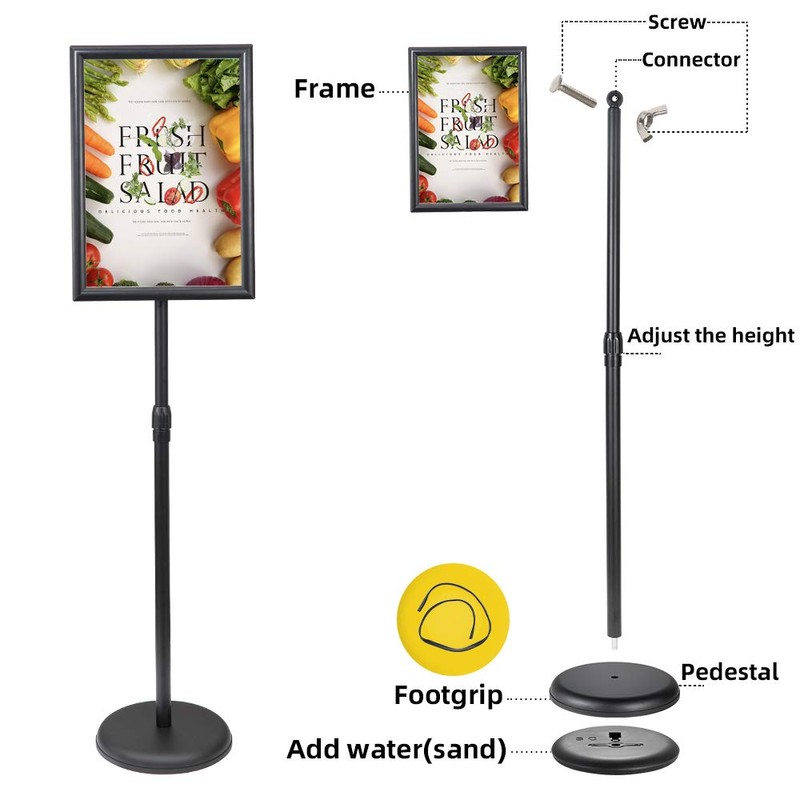- SUPERIOR QUALITY ENSURANCE - The sign holder floor stand is built with high quality metal which features with heavy duty structure, the 8lbs heavy base increase stability to prevent accident falling, while the water flooding hole allows you fill water or fine sand to increase the weight, great for indoor/ outdoor.